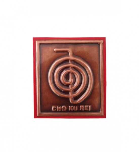 Simbolo Cho Ku Rei em chapa de cobre prensada, polida e envernizada (não oxida). Colada a uma fina chapa de plástico PS resistente e com argola de latão para pendurar na parede.